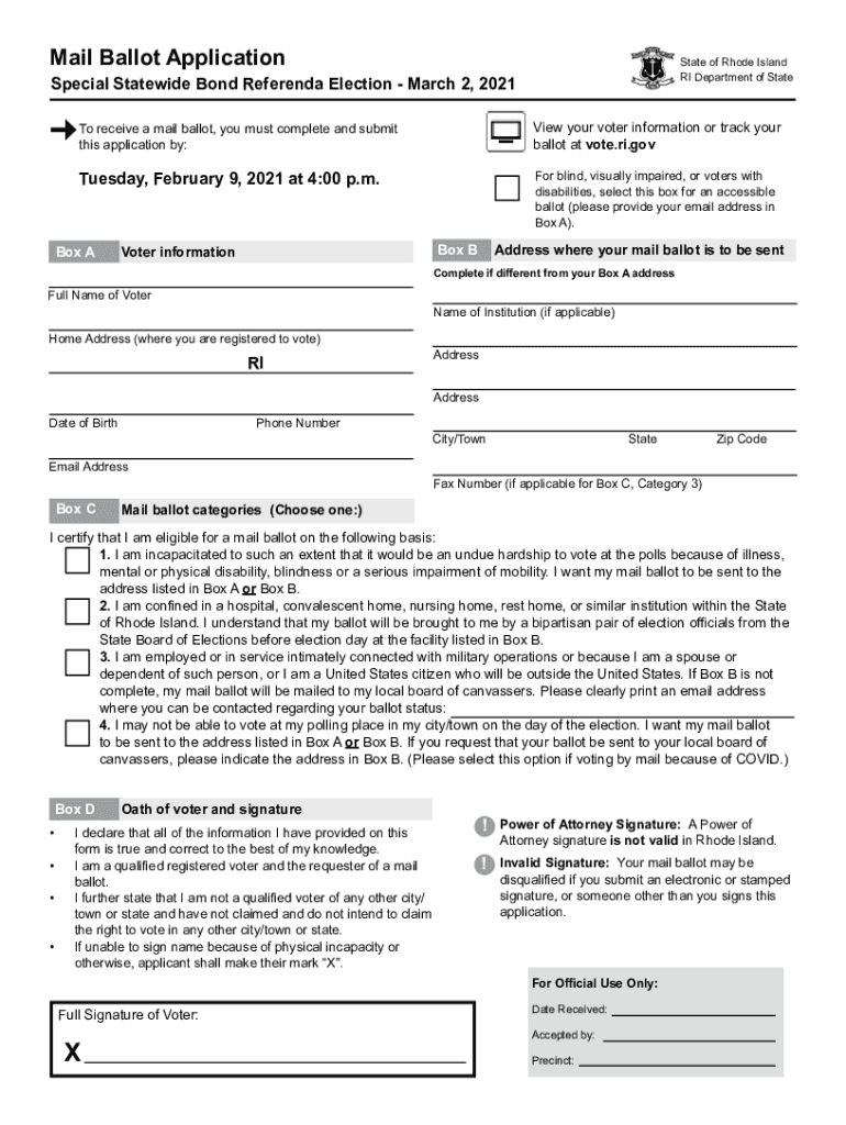 Mail Ballot ApplicationState of Rhode Island RI Department of StateSpecial Statewide Bond Reference Election March 2, 2021, To receive a mail ballot, you must complete and submit this application