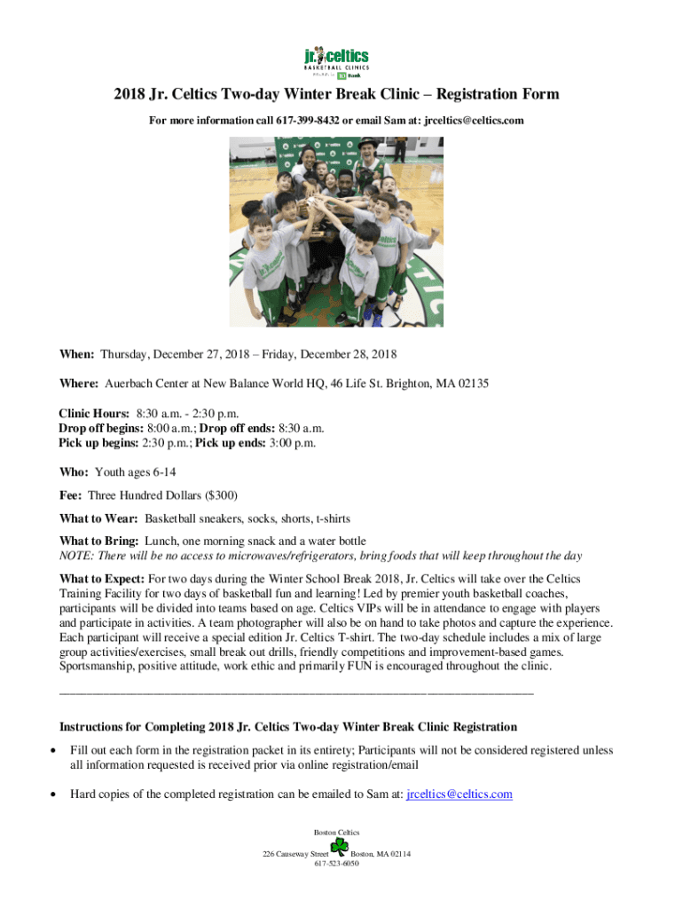 2018 Jr. Celtics Today Winter Break Clinic Registration Form For more information call 6173998432 or email Sam at: jrceltics@celtics.comWhen: Thursday, December 27, 2018, Friday, December 28, 2018,