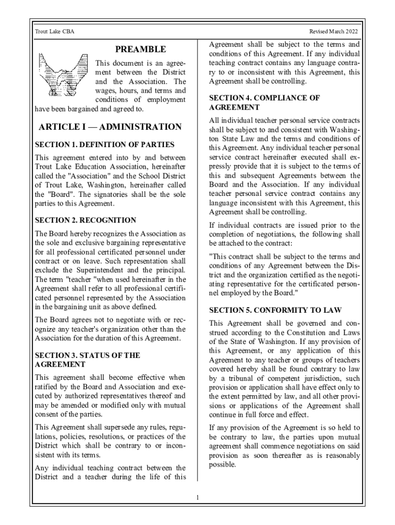Trout Lake Revised March 2022Agreement shall be subject to the terms and conditions of this Agreement. If any individual teaching contract contains any language contrary to or inconsistent with this