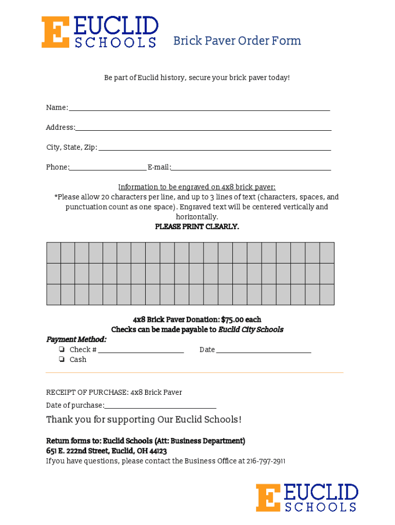 Brick Paver Order Form Be part of Euclid history, secure your brick paver today! Name: ___ Address:___ City, State, Zip: ___ Phone:___ Email:___ Information to be engraved on 4×8 brick paver: *Please