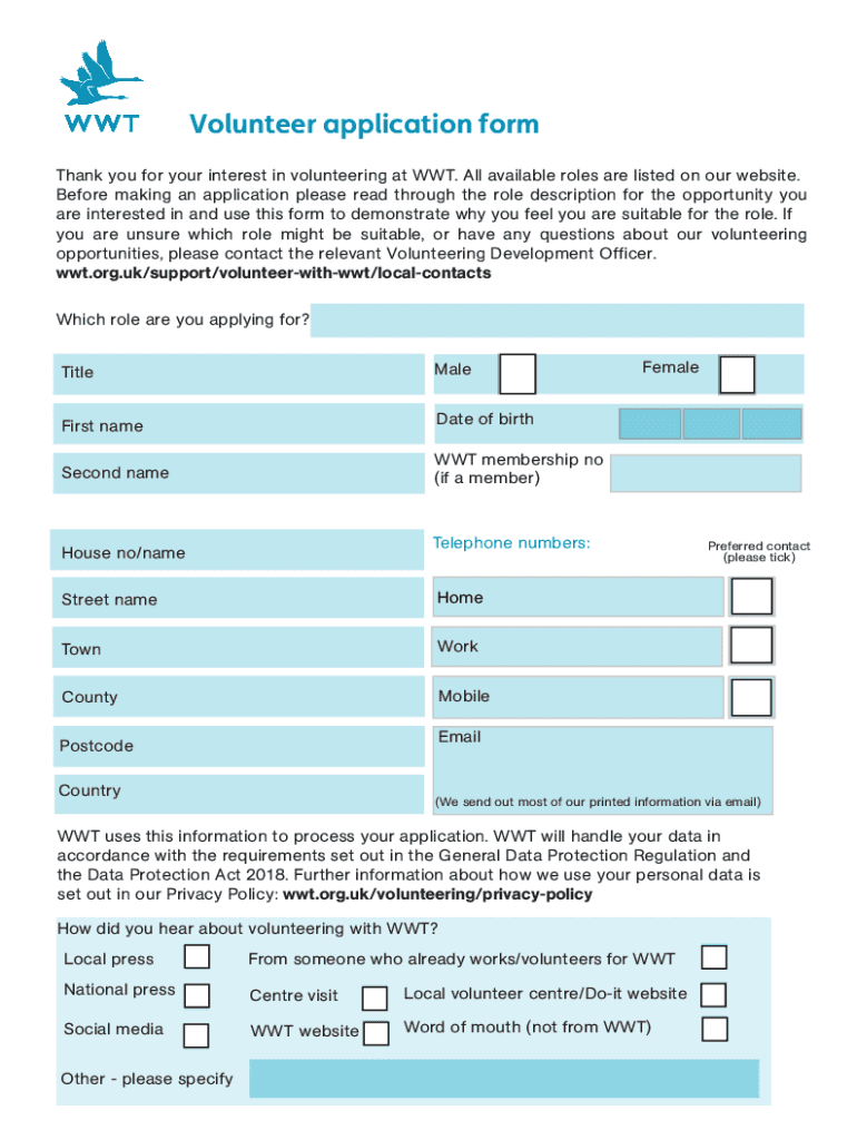 Volunteer application form Thank you for your interest in volunteering at WET. All available roles are listed on our website. Before making an application please read through the role description