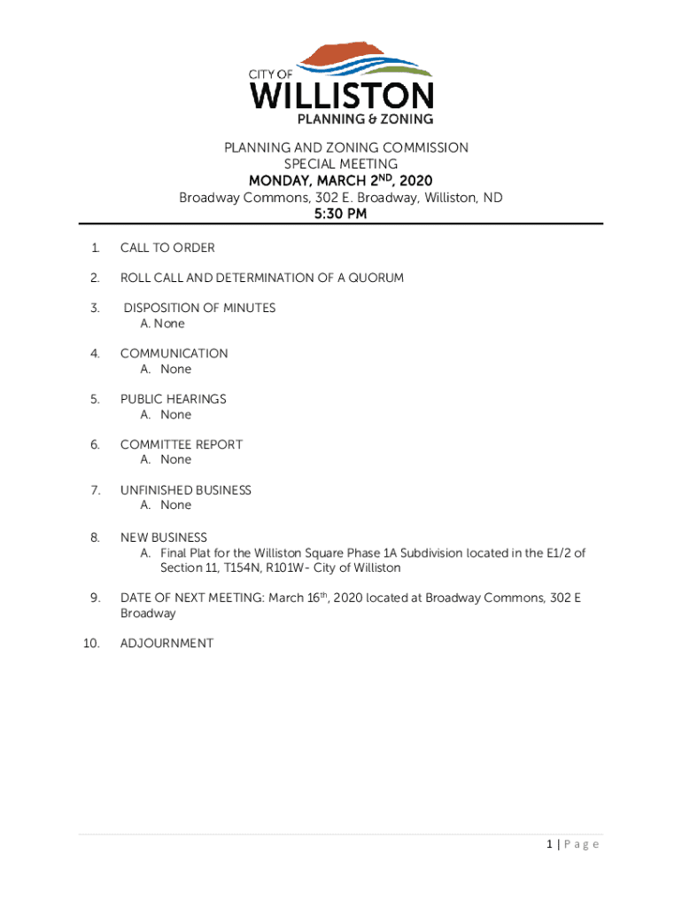 PLANNING AND ZONING COMMISSION SPECIAL MEETING MONDAY, MARCH 2ND, 2020 Broadway Commons, 302 E. Broadway, Williston, ND 5:30 PM 1.CALL TO ORDER2.ROLL CALL AND DETERMINATION OF A QUORUM3.DISPOSITION