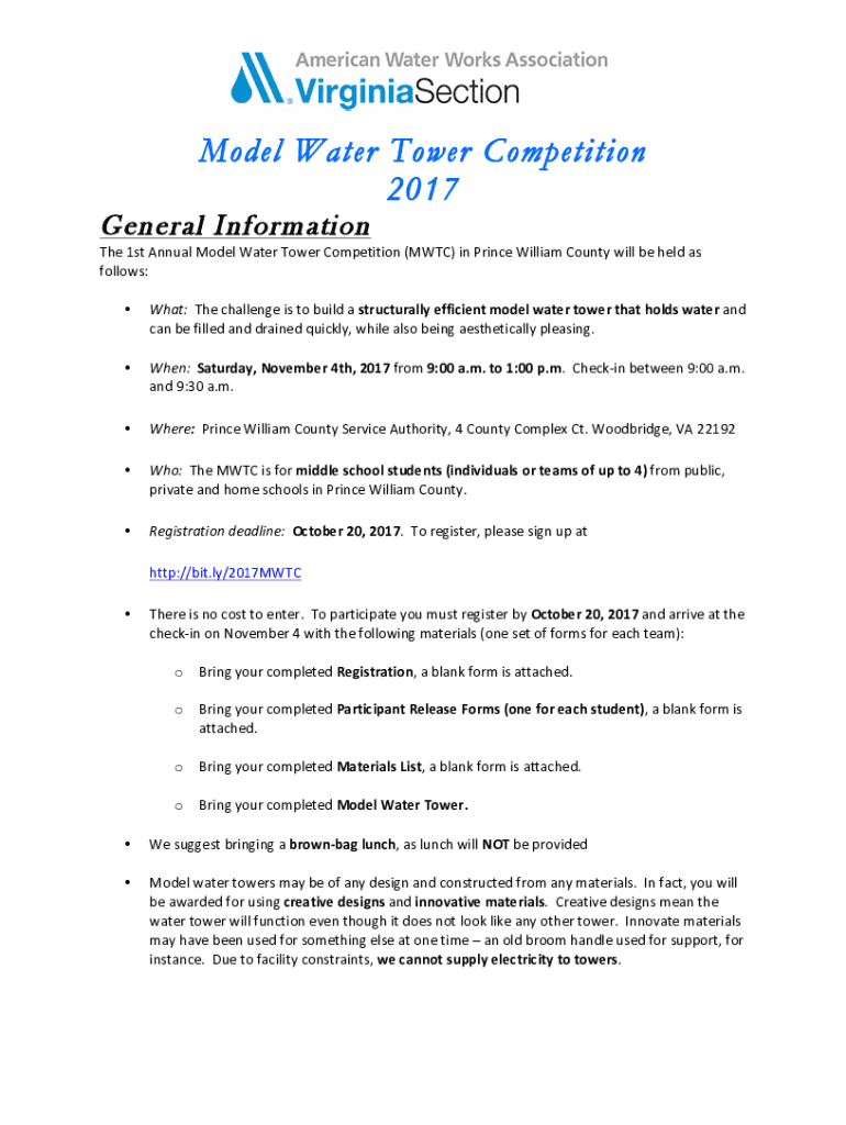 Model Water Tower Competition 2017 General Information 1st Annual Model Water Tower Competition (WTC) in Prince William County will be held as follows: What:The challenge is to build a structurally