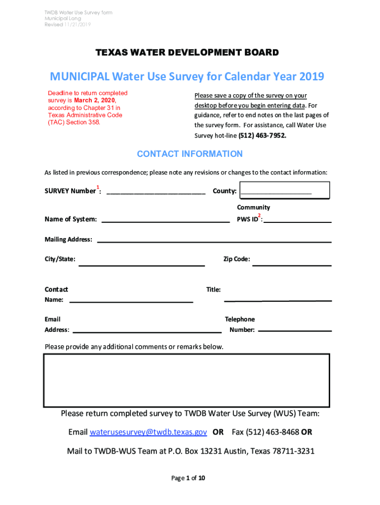 TWD Water Use Survey form Municipal Long Revised 11/21/2019TEXAS WATER DEVELOPMENT BOARDMUNICIPAL Water Use Survey for Calendar Year 2019 Deadline to return completed survey is March 2, 2020, according
