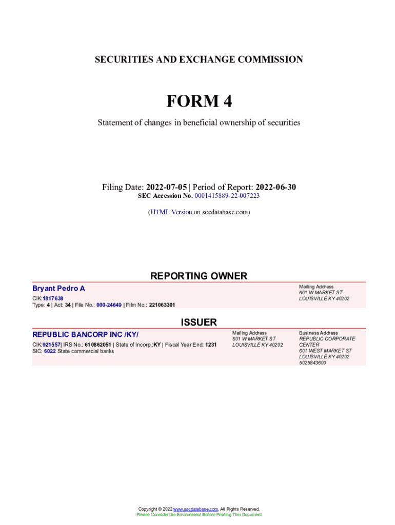 SECURITIES AND EXCHANGE COMMISSIONER 4 Statement of changes in beneficial ownership of securitiesFiling Date: 20220705 | Period of Report: 20220630 SEC Accession No. 000141588922007223 (HTML Version