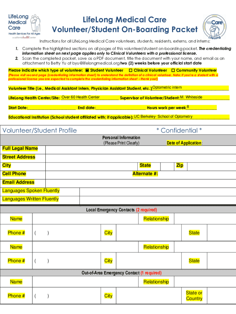 Lifelong Medical Care Volunteer/Student OnBoarding Packet Instructions for all Lifelong Medical Care volunteers, students, residents, ex terns, and interns: 1. Complete the highlighted sections on