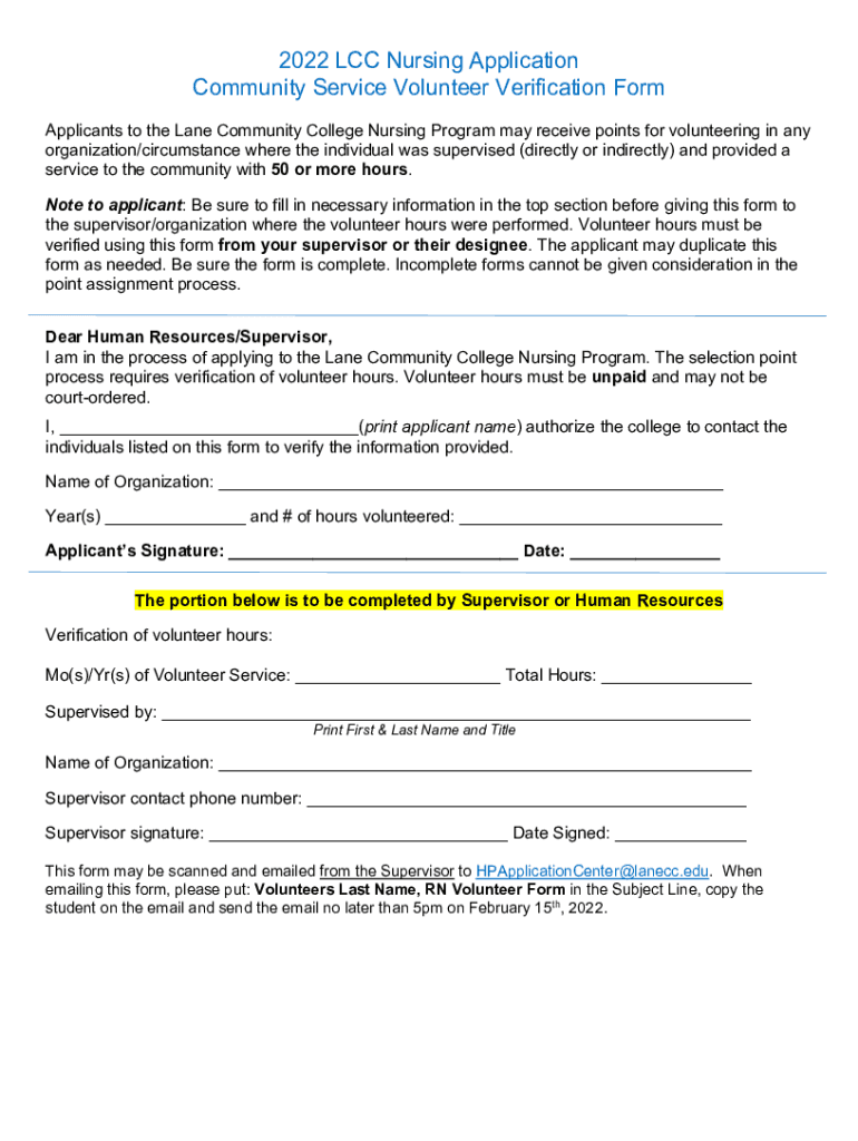 2022 LCC Nursing Application Community Service Volunteer Verification Form Applicants to the Lane Community College Nursing Program may receive points for volunteering in any organization/circumstance