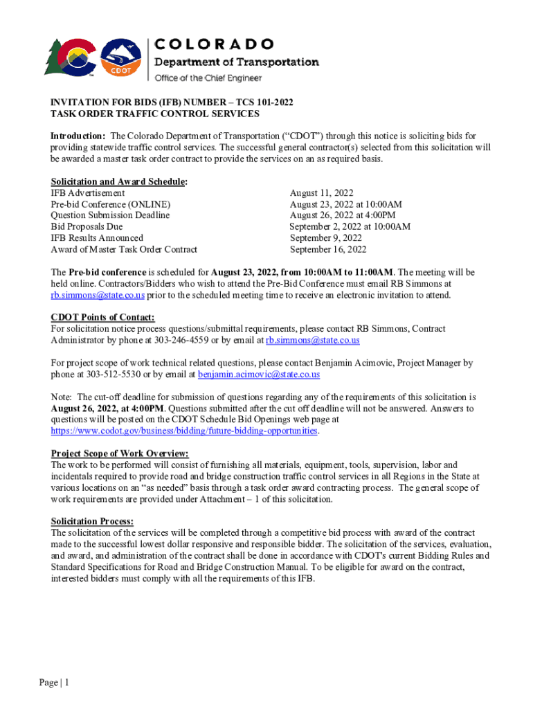 INVITATION FOR BIDS (IF) NUMBER TCS 1012022 TASK ORDER TRAFFIC CONTROL SERVICES Introduction: The Colorado Department of Transportation (DOT) through this notice is soliciting bids for providing statewide