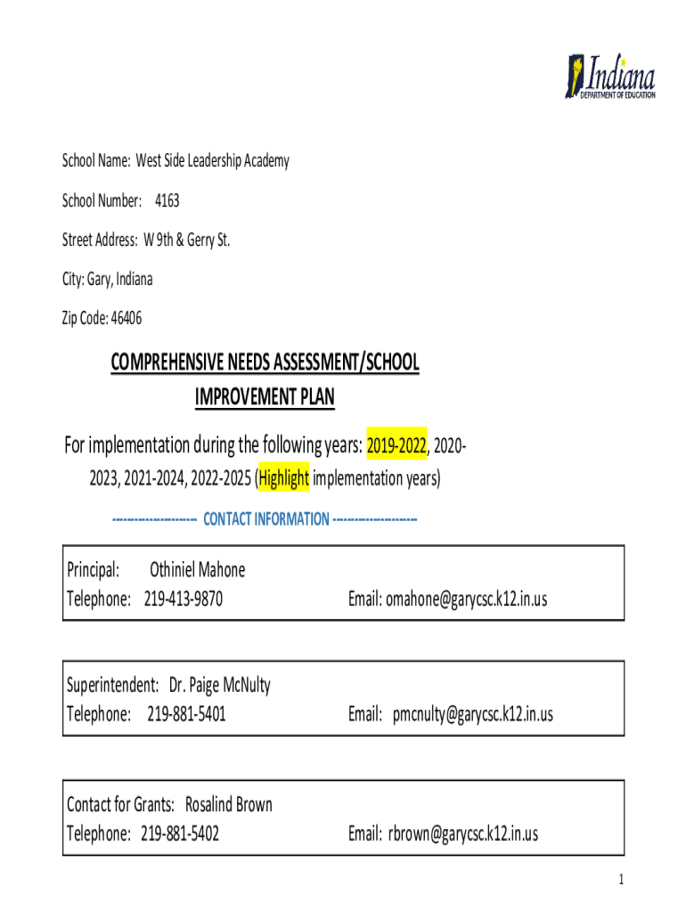 School Name: West Side Leadership Academy School Number:4163Street Address: W 9th & Gerry St. City: Gary, Indiana Zip Code: 46406COMPREHENSIVE NEEDS ASSESSMENT/SCHOOL IMPROVEMENT PLAN For implementation