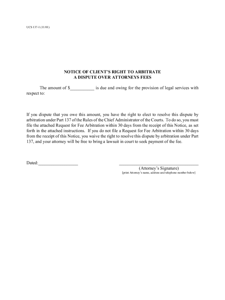 UCS 1371 (11/01)NOTICE OF CLIENTS RIGHT TO ARBITRATE A DISPUTE OVER ATTORNEYS FEES The amount of $___ is due and owing for the provision of legal services with respect to:If you dispute that you owe