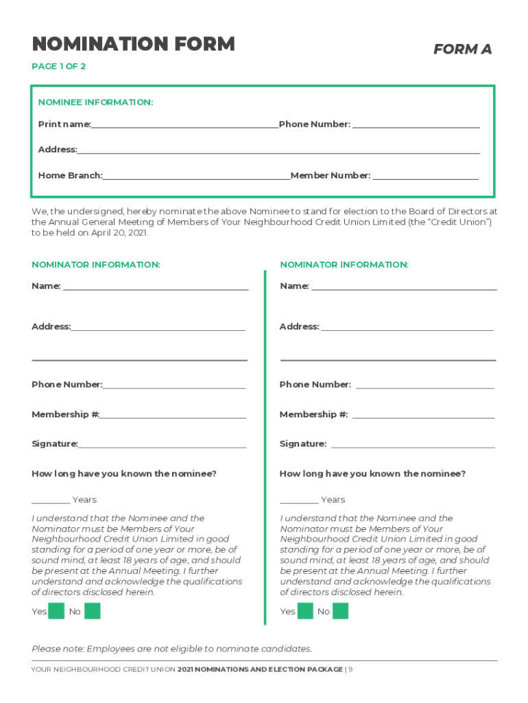 2021 NOMINATIONS AND ELECTION PACKAGE Forms included in the package must be completed and returned by November 23, 2020, at 5:00 pm. Late or incomplete forms after this time will result in the nomination