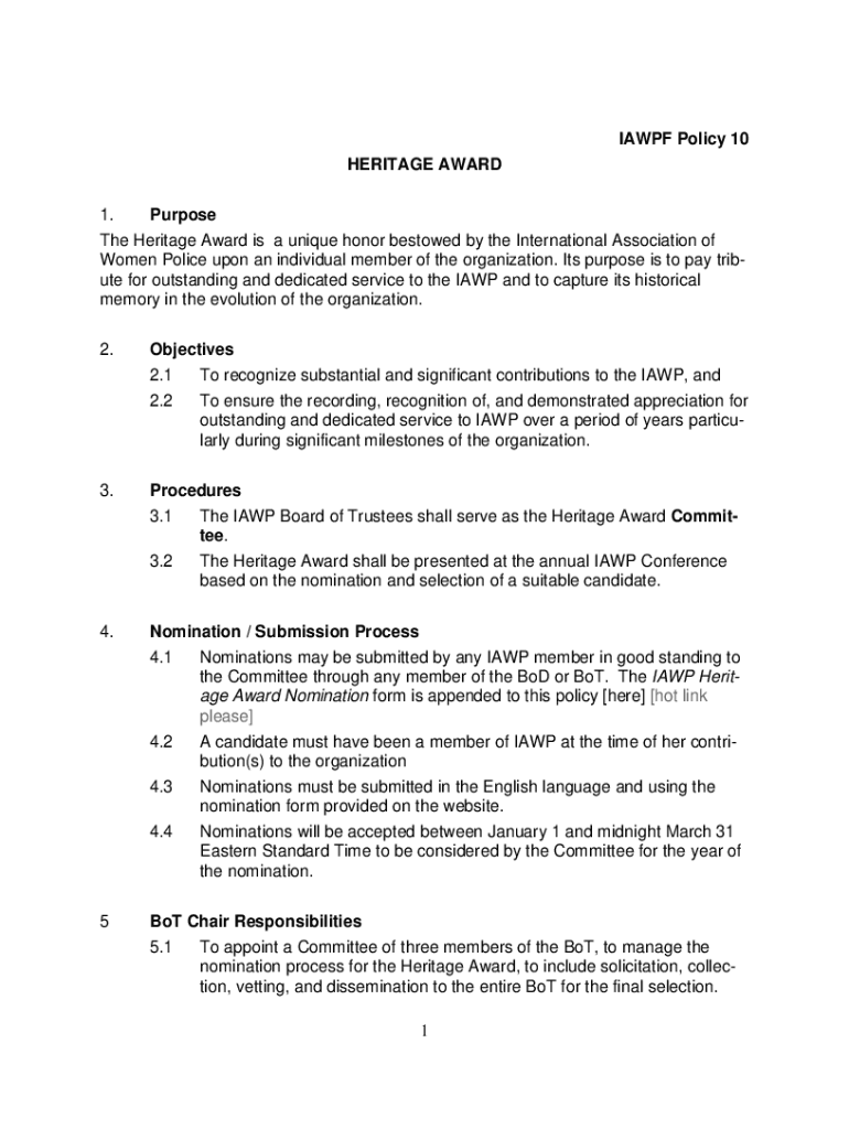 IA WPF Policy 10 HERITAGE AWARD 1. Purpose The Heritage Award is a unique honor bestowed by the International Association of Women Police upon an individual member of the organization. Its purpose