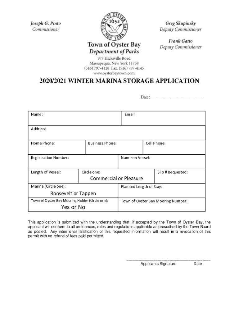 2020/2021 WINTER MARINA STORAGE APPLICATION Date: ___Name:Email:Address: Home Phone:Business Phone:Registration Number:Cell Phone: Name on Vessel:Circle one:Length of Vessel:Slip # Requested:Commercial