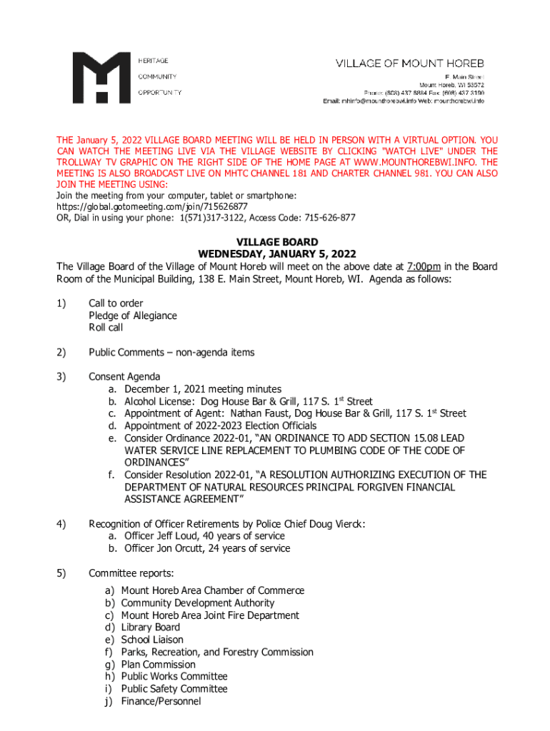 THE January 5, 2022, VILLAGE BOARD MEETING WILL BE HELD IN PERSON WITH A VIRTUAL OPTION. YOU CAN WATCH THE MEETING LIVE VIA THE VILLAGE WEBSITE BY CLICKING \” WATCH LIVE\” UNDER THE TOLLWAY TV