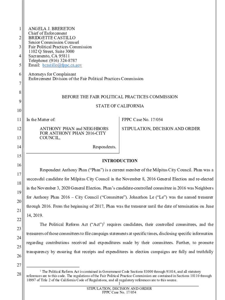 1 2 3 4 5 6ANGELA J. BRETON Chief of Enforcement BRIDGETTE CASTILLO Senior Commission Counsel Fair Political Practices Commission 1102 Q Street, Suite 3000 Sacramento, CA 95811 Telephone: (916) 3248787