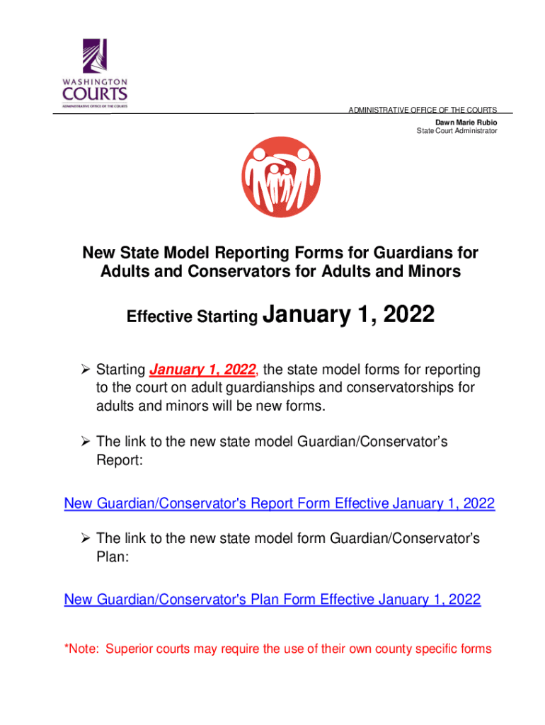 ADMINISTRATIVE OFFICE OF THE COURTS Dawn Marie Rubio State Court Administrator State Model Reporting Forms for Guardians for Adults and Conservators for Adults and Minors Effective Starting January1,