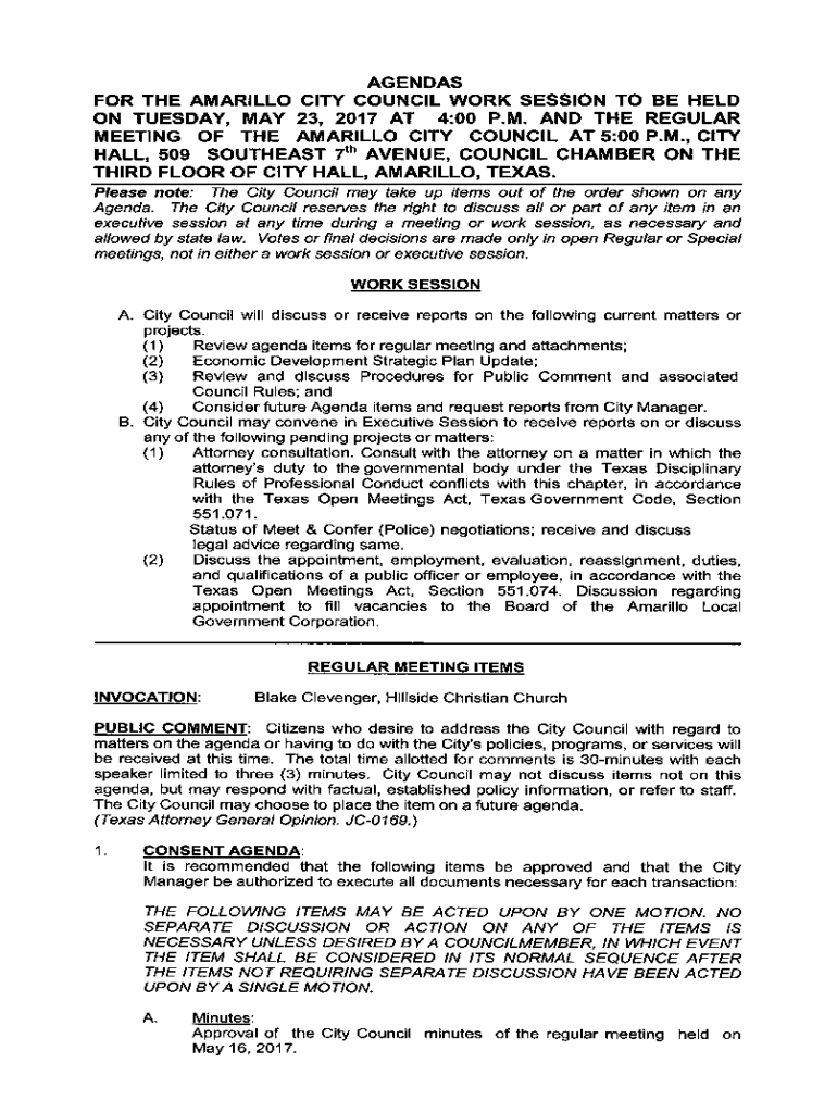 AGENDAS THE AMARILLO CITY COUNCIL WORK SESSION TO BE SHELDON TUESDAY, MAY 23, 2017, AT 4:00 P.M. AND THE REGULAR MEETING OF THE AMARILLO CITY COUNCIL AT 5:00 P.M., CATCHALL, 509 SOUTHEAST 7th AVENUE,
