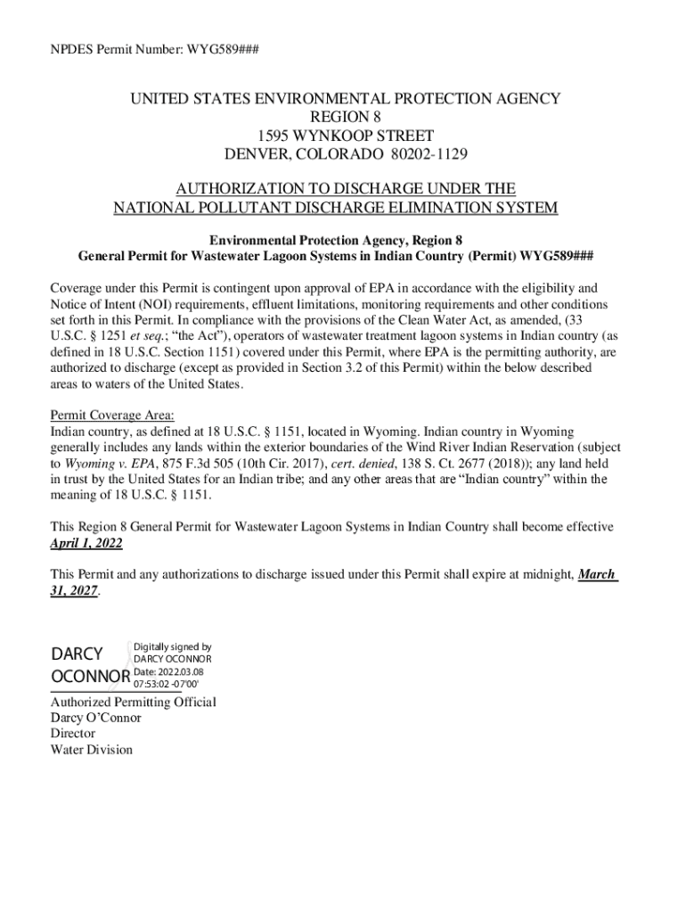 NODES Permit Number: WYG589###UNITED STATES ENVIRONMENTAL PROTECTION AGENCY REGION 8 1595 SNOOP STREET DENVER, COLORADO 802021129 AUTHORIZATION TO DISCHARGE UNDER THE NATIONAL POLLUTANT DISCHARGE