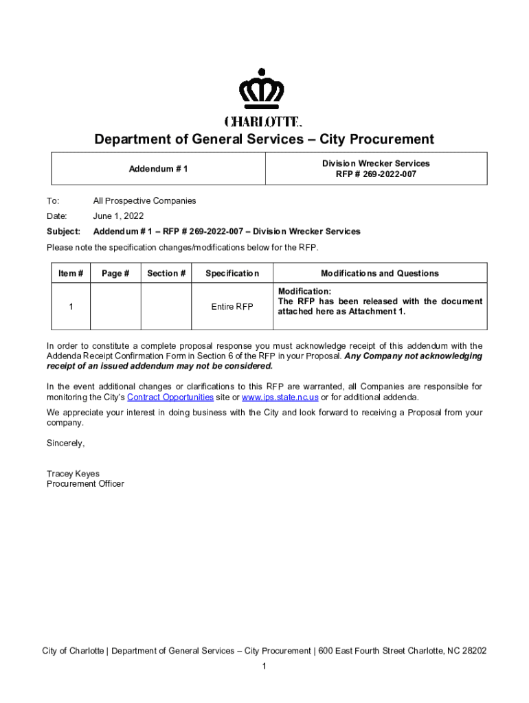 Department of General Services City Procurement Division Wrecker Services RFP # 2692022007Addendum # 1 To:All Prospective CompaniesDate:June 1, 2022Subject:Addendum # 1 RFP # 2692022007 Division Wrecker