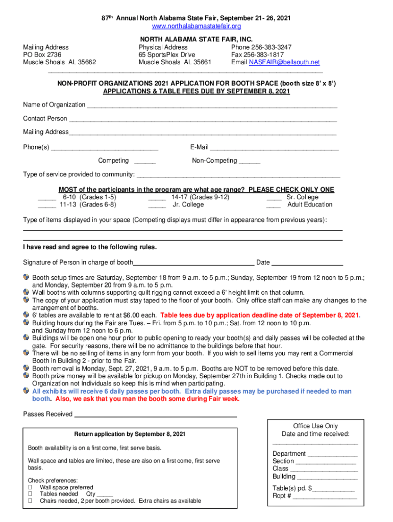 To fill out paperwork for North Alabama State Fairgrounds, organizers typically need to provide details about the event, vendors, and any necessary permits.