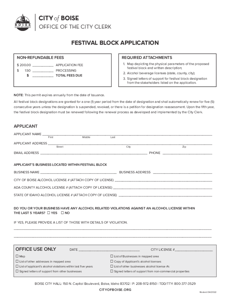 OFFICE OF THE CITY CLERKFESTIVAL BLOCK APPLICATION NONREFUNDABLE FEESREQUIRED ATTACHMENTS 1. Map depicting the physical parameters of the proposed festival block and written description;$200.00___APPLICATION