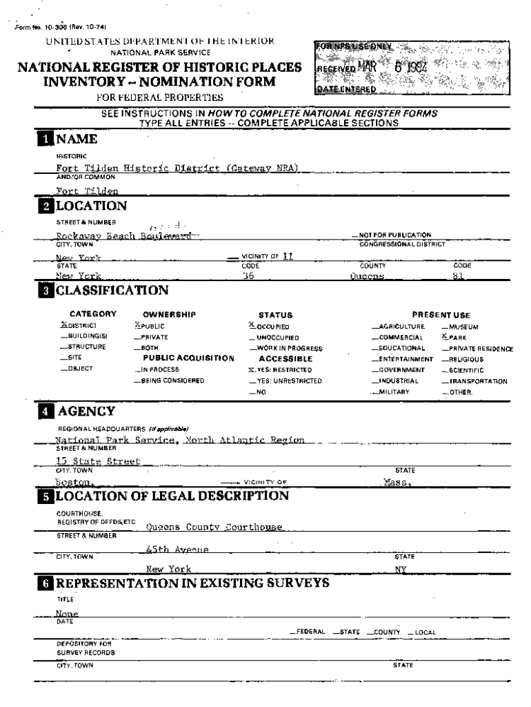 Form No. 10306 (Rev. 1074)UNITEDSTATESDEPARTMENTOFTHE INTERIOR NATIONAL PARK SERVICENATIONAL REGISTER OF HISTORIC PLACES INVENTORY NOMINATION FORM FOR FEDERAL PROPERTIES SEE INSTRUCTIONS IN HO WTO
