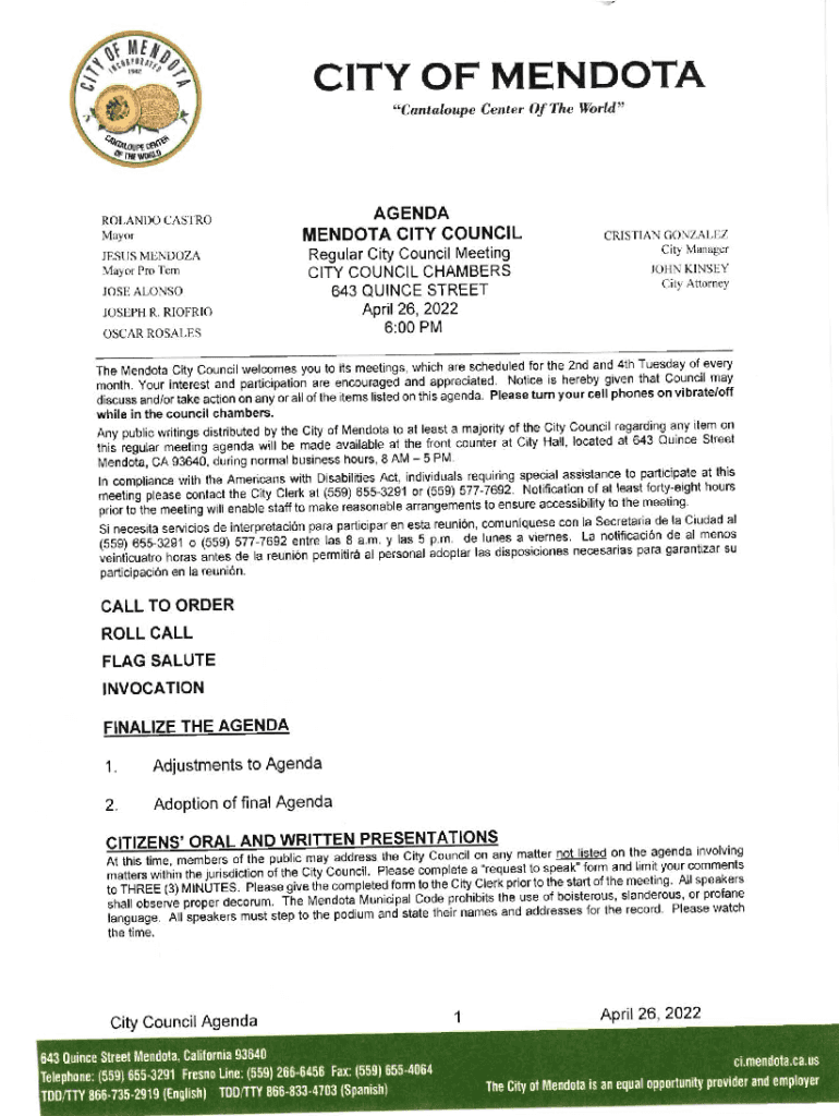 CITY MENDOZA, Cantaloupe Center Of The World\” ROLANDO CASTRO Mayor JESUSMENDOZAMayor Pro Tem JOSE ALONSO JOSEPH R. RIOFRIOOSCAR ROSALESAGENDA MENDOZA CITY COUNCIL Regular City Council Meeting CITY