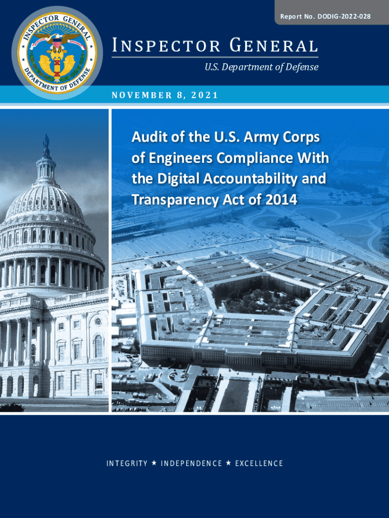 Report No. DODIG2022028I spec tor Ge né Yalu. S. Department of DefenseNOVEMBER 8, 2021Audit of the U.S. Army Corps of Engineers Compliance With the Digital Accountability and Transparency Act of