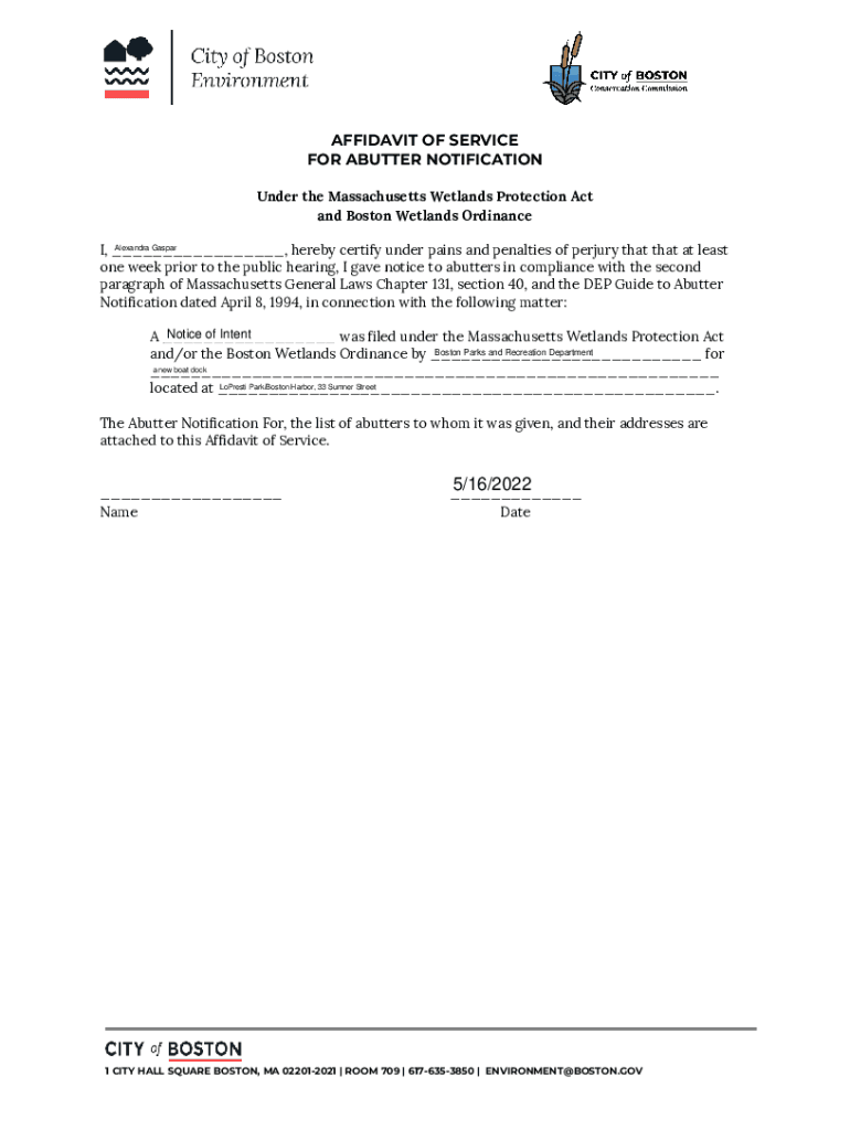 Notice of Intent May 2022BOSTON FOREST BOAT DOCK PREPARED FOR: BOSTON PARKS AND RECREATION SUBMITTED TO: Boston Conservation Commission55 Walkers Brook Drive, Suite 100, Reading, MA 01867 Tel: 978.532.1900May