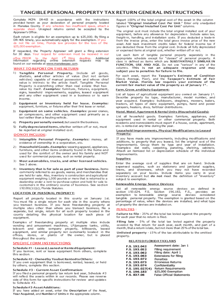 TANGIBLE PERSONAL PROPERTY TAX RETURN GENERAL INSTRUCTIONS Complete MCPA DR405 in accordance with the instructions provided herein as your declaration of personal property located in Manatee County.