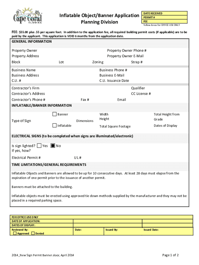 DATE RECEIVED PERMIT # Inflatable Object/Banner Application Planning DivisionYellow Areas for OFFICE USE ONLY: $55.00 plus .55 per square foot. In addition to the application fee, all required building