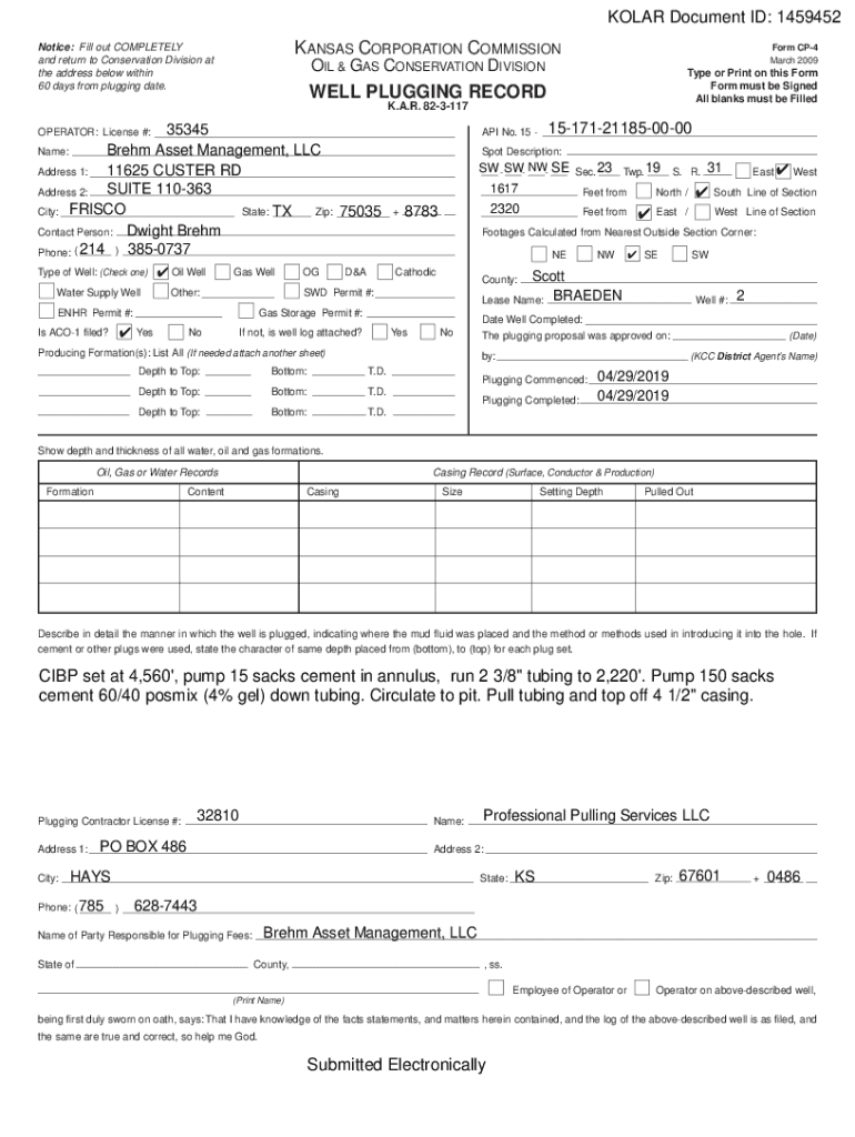 SOLAR Document ID: 1459452Kansas Corporation CommissionNotice: Fill out COMPLETELY and return to Conservation Division at the address below within 60 days from plugging date. Form CP4 March 2009Oil