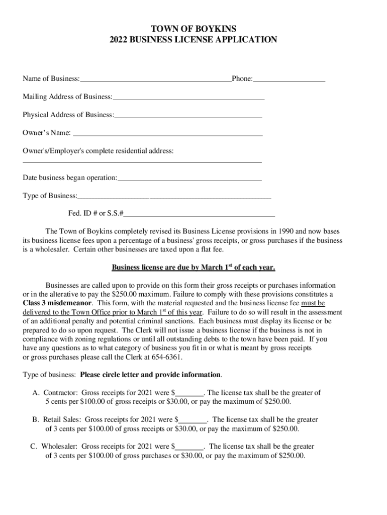 TOWN OF BODKINS 2022 BUSINESS LICENSE APPLICATIONName of Business:___Phone:___ Mailing Address of Business:___ Physical Address of Business:___ Owners Name: ___ Owner\'s/Employer\'s complete residential