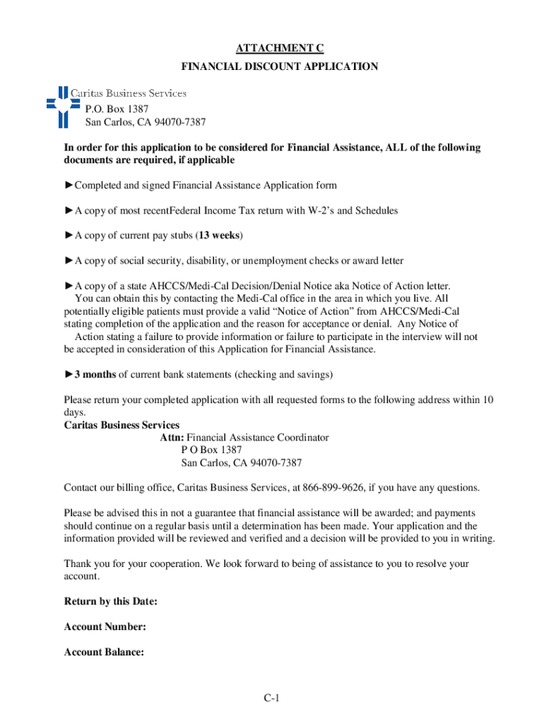 ATTACHMENT C FINANCIAL DISCOUNT APPLICATION. O. Box 1387 San Carlos, CA 940707387 In order for this application to be considered for Financial Assistance, All the following documents are required,