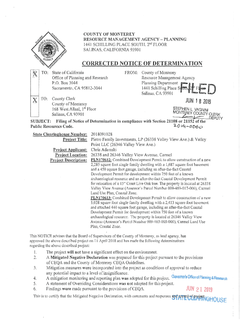 COUNTY OF MONTEREY RESOURCE MANAGEMENT AGENCY PLANNING 1441 SCHILLING PLACE SOUTH, 2nd FLOOR SALINAS, CALIFORNIA 93.90 corrected NOTICE OF DETERMINATION ;tr, _ h :Office of Planning and Research P.O.