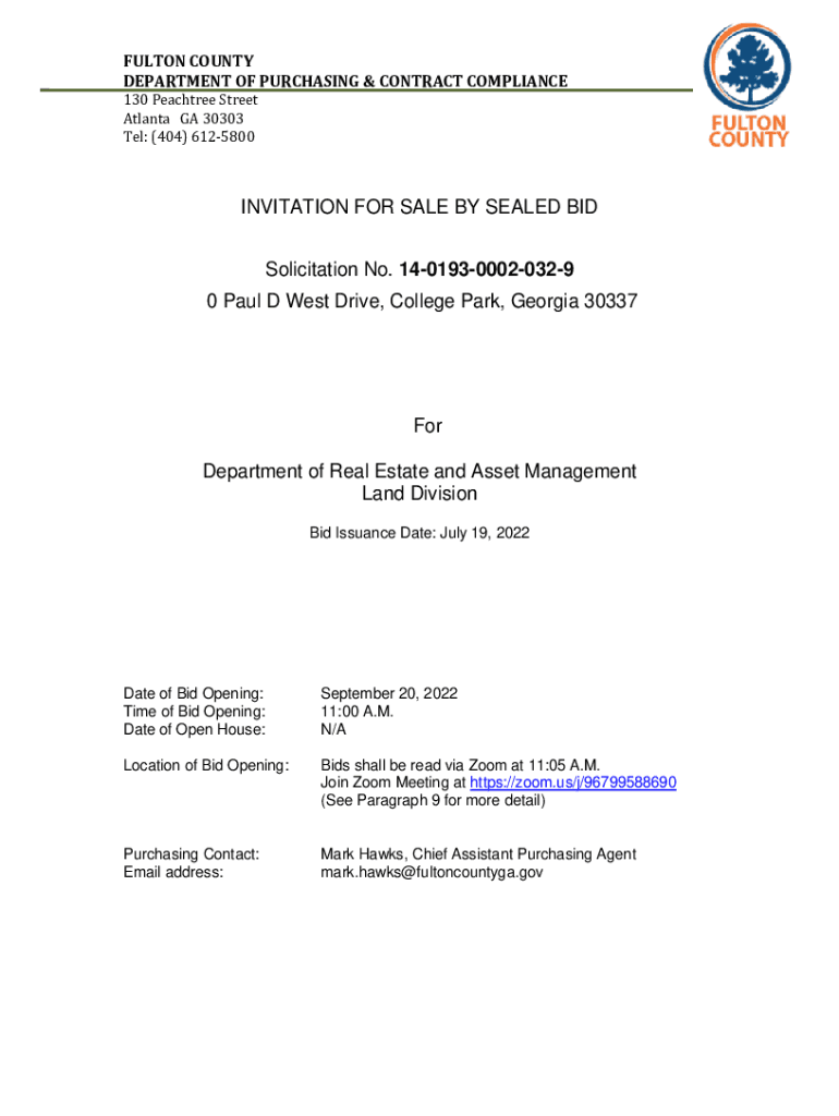 FULTON COUNTY DEPARTMENT OF PURCHASING & CONTRACT COMPLIANCE 130 Peachtree Street Atlanta GA 30303 Tel: (404) 6125800INVITATION FOR SALE BY SEALED BID Solicitation No. 14019300020329 0 Paul D West