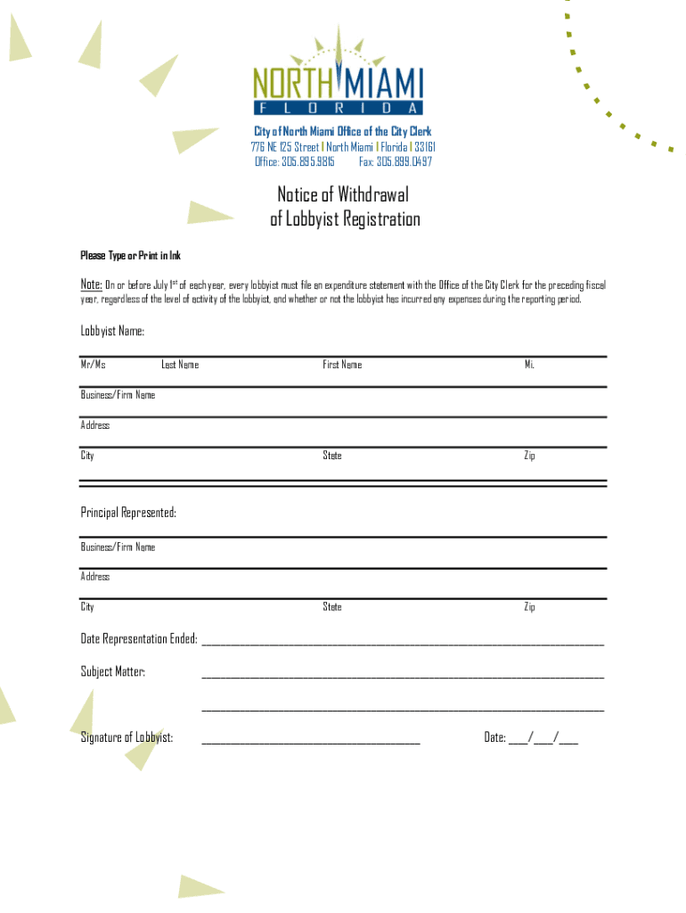 City of North Miami Office of the City Clerk 776 NE 125 Street I North Miami I Florida I 33161 Office: 305.895.9815 Fax: 305.899.0497Notice of Withdrawal of Lobbyist Registration Please Type or Print