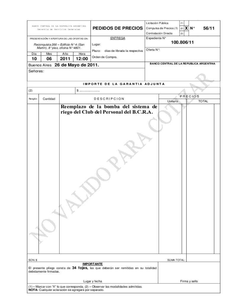 BANCO CENTRAL DE LA REPUBLICAN ARGENTINA Garcia de Servicios GeneralesPEDIDOS DE PRECIOUS ENTREGAPRESENTACIN Y APERTURE DE LAS OPERAS EN:Reconquista 266 Edifice N 4 (San Martin), 8 pesos, official