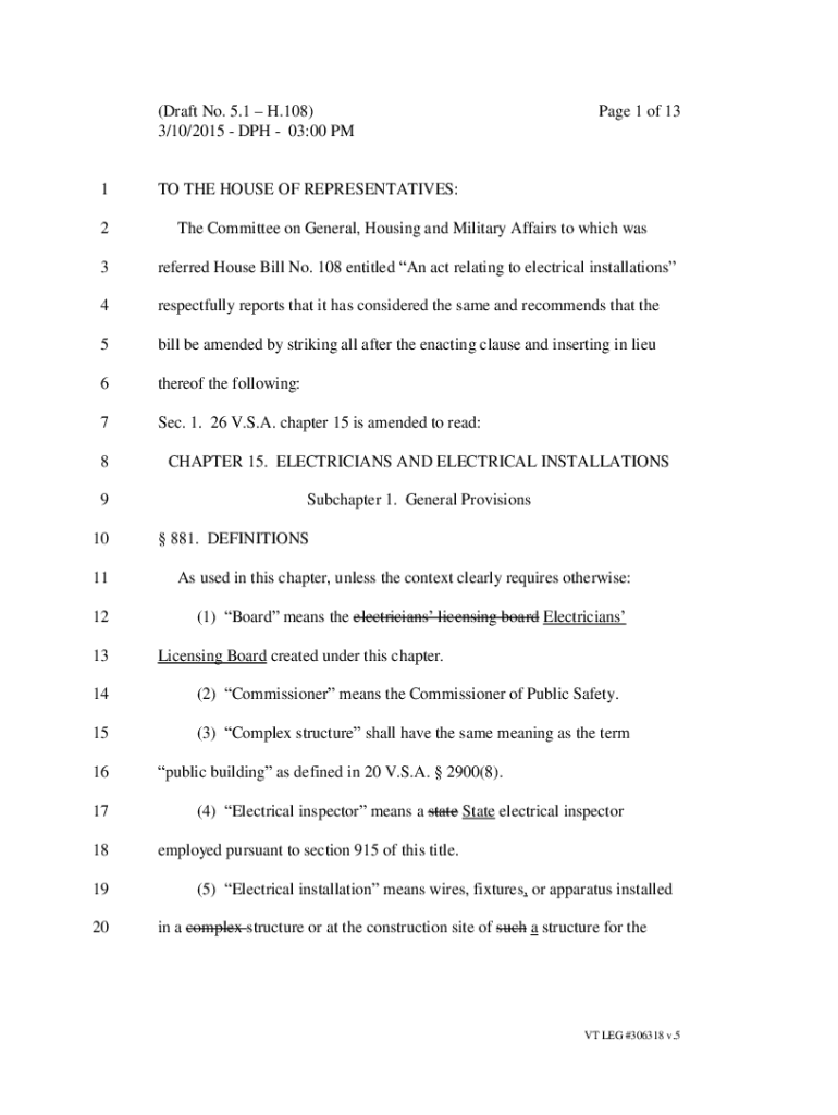 (Draft No. 5.1 H.108) 3/10/2015 DPH 03:00 PM1Page 1 of 13TO THE HOUSE OF REPRESENTATIVES:2The Committee on General, Housing and Military Affairs to which was3referred House Bill No. 108 entitled An