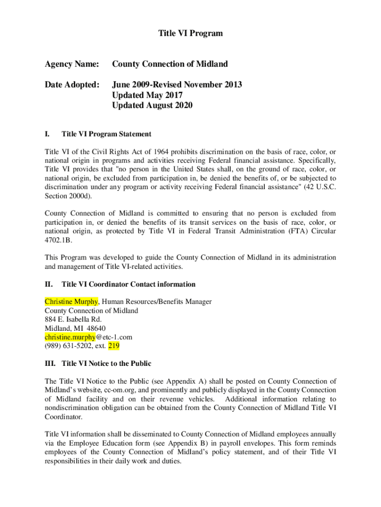 Title VI ProgramAgency Name:County Connection of MidlandDate Adopted:June 2009Revised November 2013 Updated May 2017 Updated August 2020I. Title VI Program StatementTitle VI of the Civil Rights Act