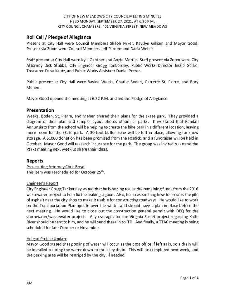 CITY OF NEW MEADOWS CITY COUNCIL MEETING MINUTES HELD MONDAY, SEPTEMBER 27, 2021, AT 6:30 P.M. CITY COUNCIL CHAMBERS, 401 VIRGINIA STREET, NEW MEADOWSRoll Call / Pledge of Allegiance Present at City