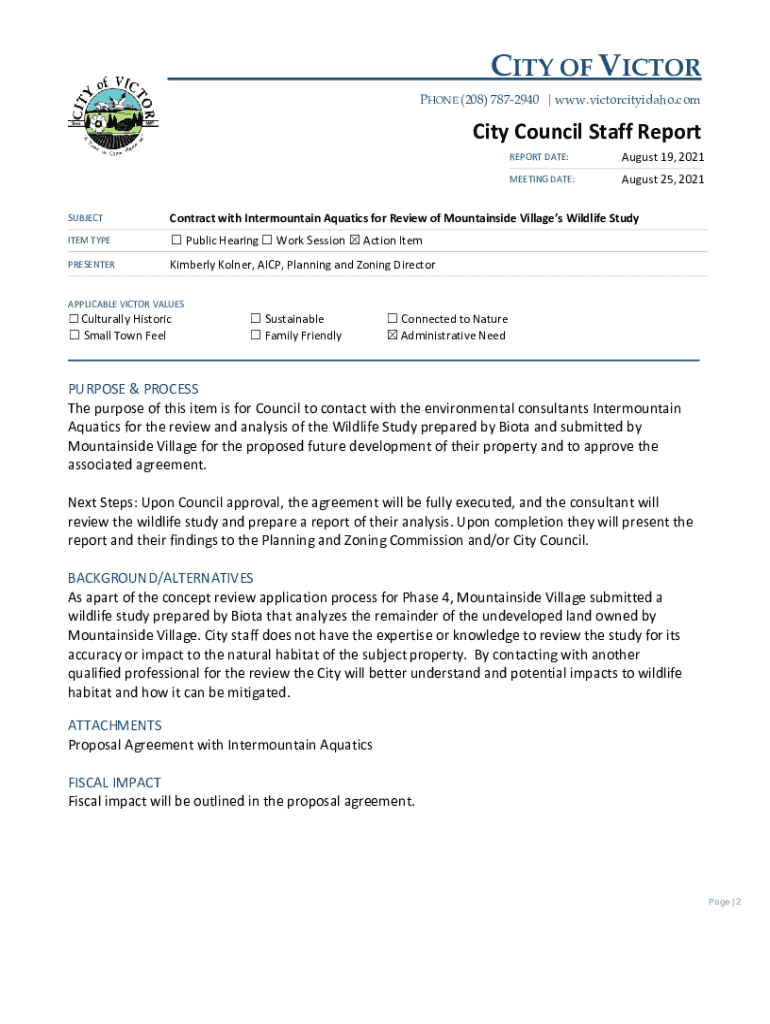 CITY OF VICTOR PHONE (208) 7872940 | www.victorcityidaho.comCity Council Staff Report DATE:August 19, 2021MEETING DATE:August 25, 2021SUBJECTContract with Intermountain Aquatics for Review of Mountainside