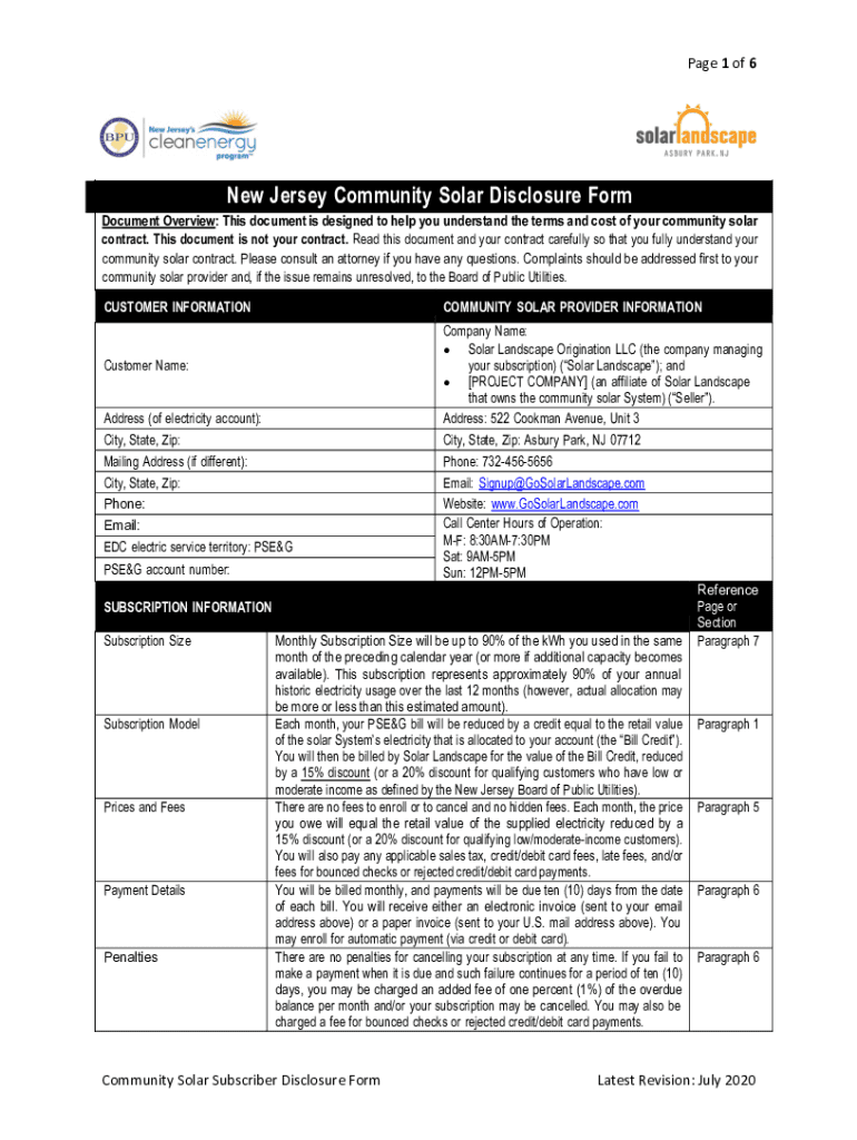 Page 1 of 6New Jersey Community Solar Disclosure Form Document Overview: This document is designed to help you understand the terms and cost of your community solar contract. This document is not