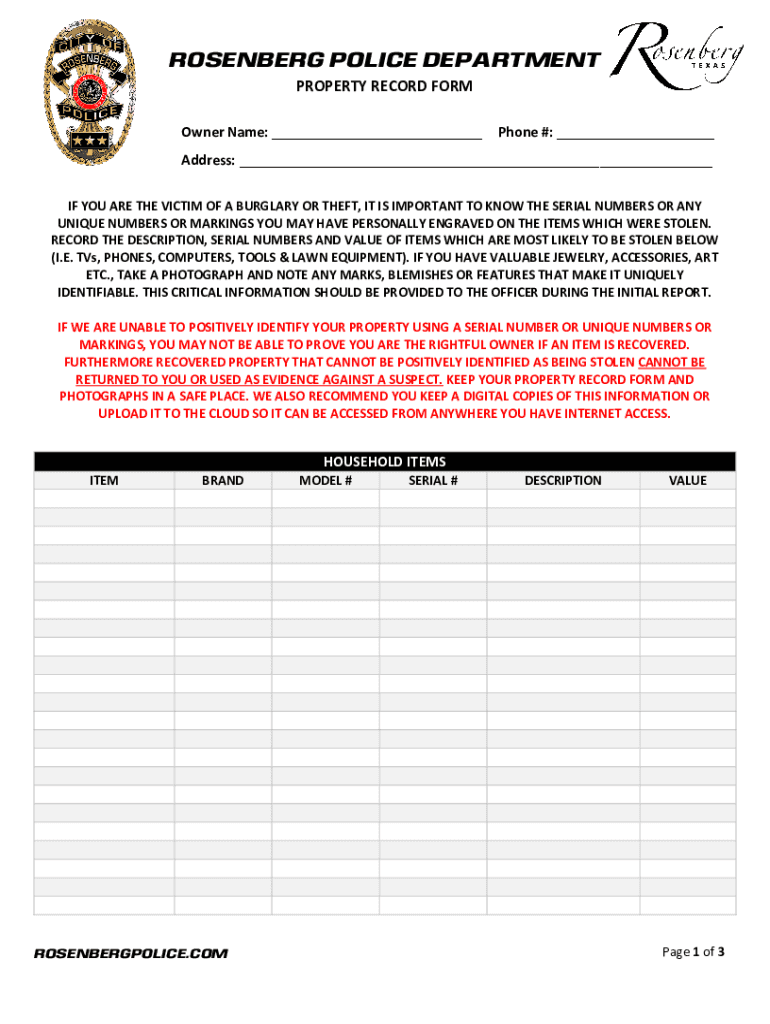 ROSENBERG POLICE DEPARTMENT PROPERTY RECORD FORM Owner Name: ___Phone #: ___Address: ___ IF YOU ARE THE VICTIM OF A BURGLARY OR THEFT, IT IS IMPORTANT TO KNOW THE SERIAL NUMBERS OR ANY UNIQUE NUMBERS