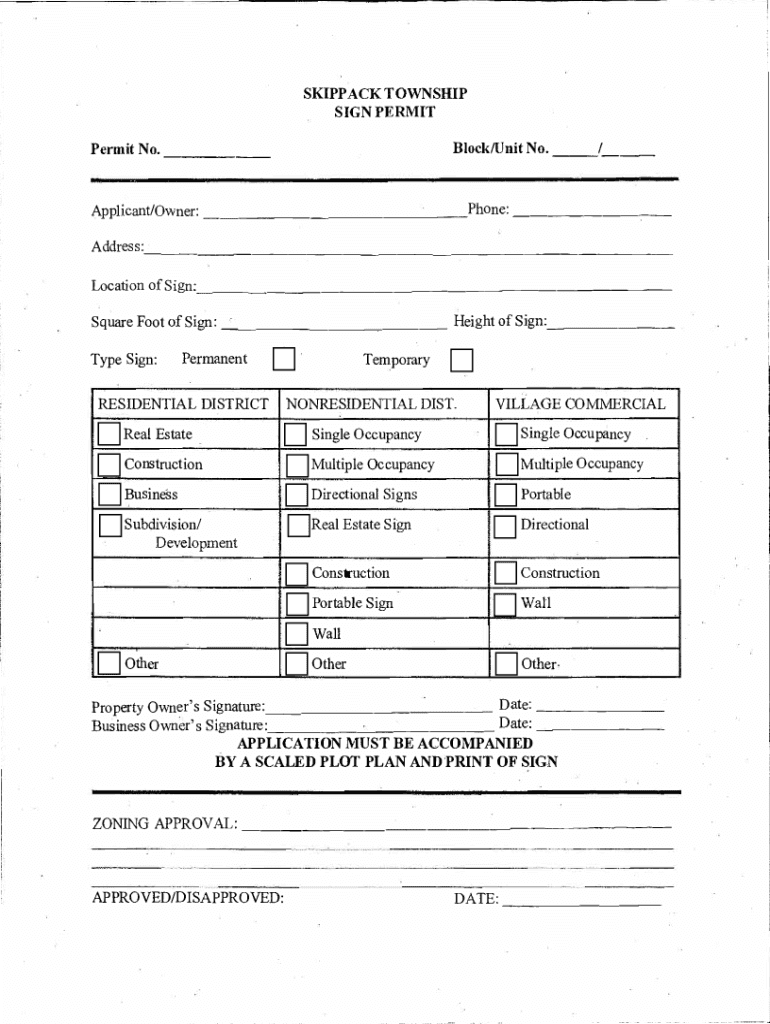 SKIPPED TOWNSHIP SIGN PERMIT Block/Unit No. ___/___Permit No. ___Applicant/Owner: ___Phone: ___ Address:___ __ ___ __ ___ Location of Sign:.__ ___ ___ Square Foot of Sign: ___ Height of Sign:___ Type