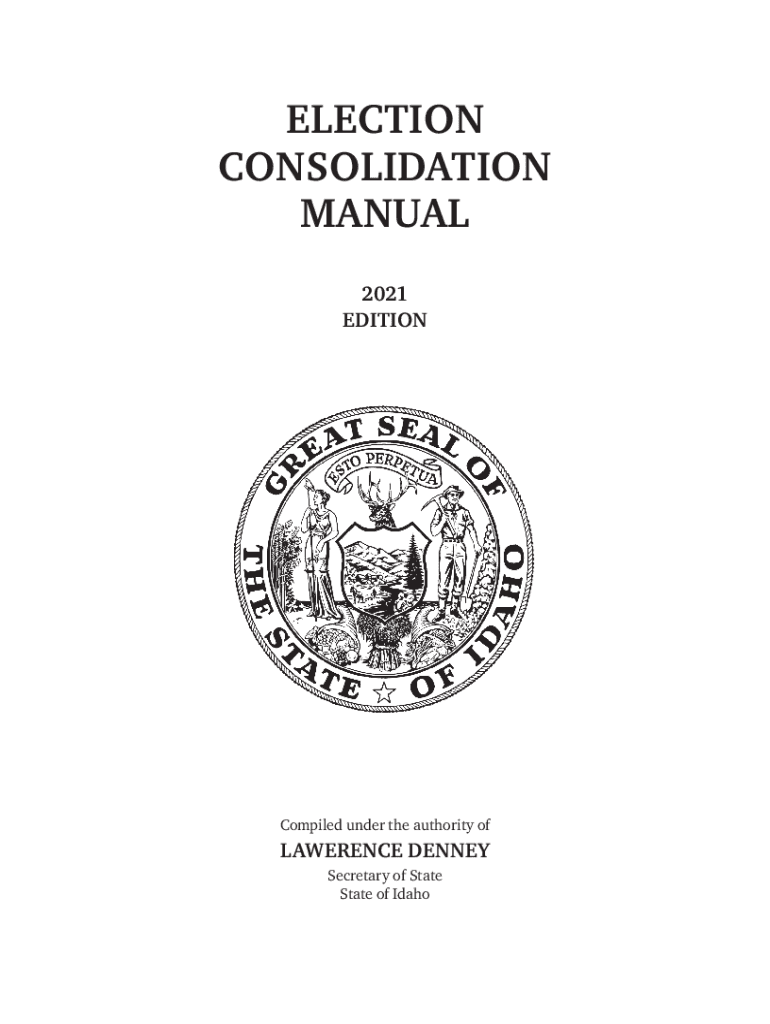 ELECTION CONSOLIDATION MANUAL 2021 EDITIONCompiled under the authority Lawrence DENNY Secretary of State of Apostate OF IDAHO OFFICE OF THE SECRETARY OF STATE LAWRENCE DENNY Dear Election Official: