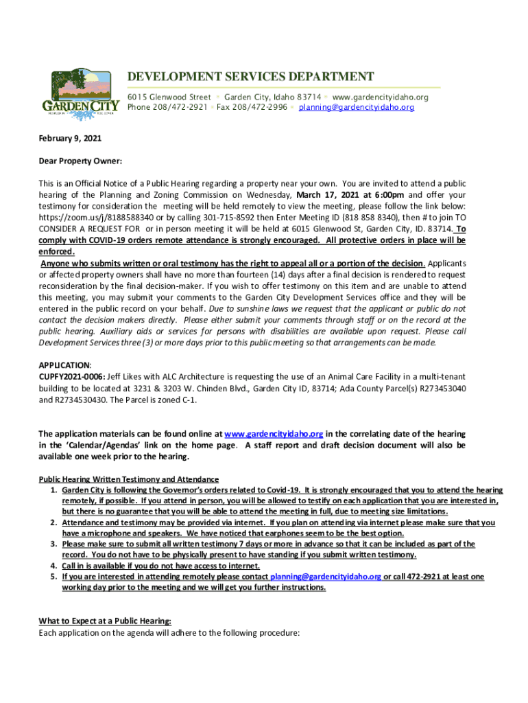 DEVELOPMENT SERVICES DEPARTMENT 6015 Glenwood Street Garden City, Idaho 83714 www.gardencityidaho.org Phone 208/4722921 Fax 208/4722996 planning@gardencityidaho.orgFebruary 9, 2021 Dear Property Owner: