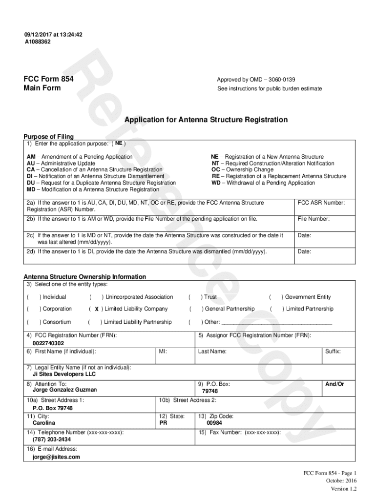 09/12/2017 at 13:24:42 A1088362ReFCC Form 854 Main Preapproved by OLD 30600139 See instructions for public burden estimateApplication for Antenna Structure RegistrationferPurpose of Filing1) Enter