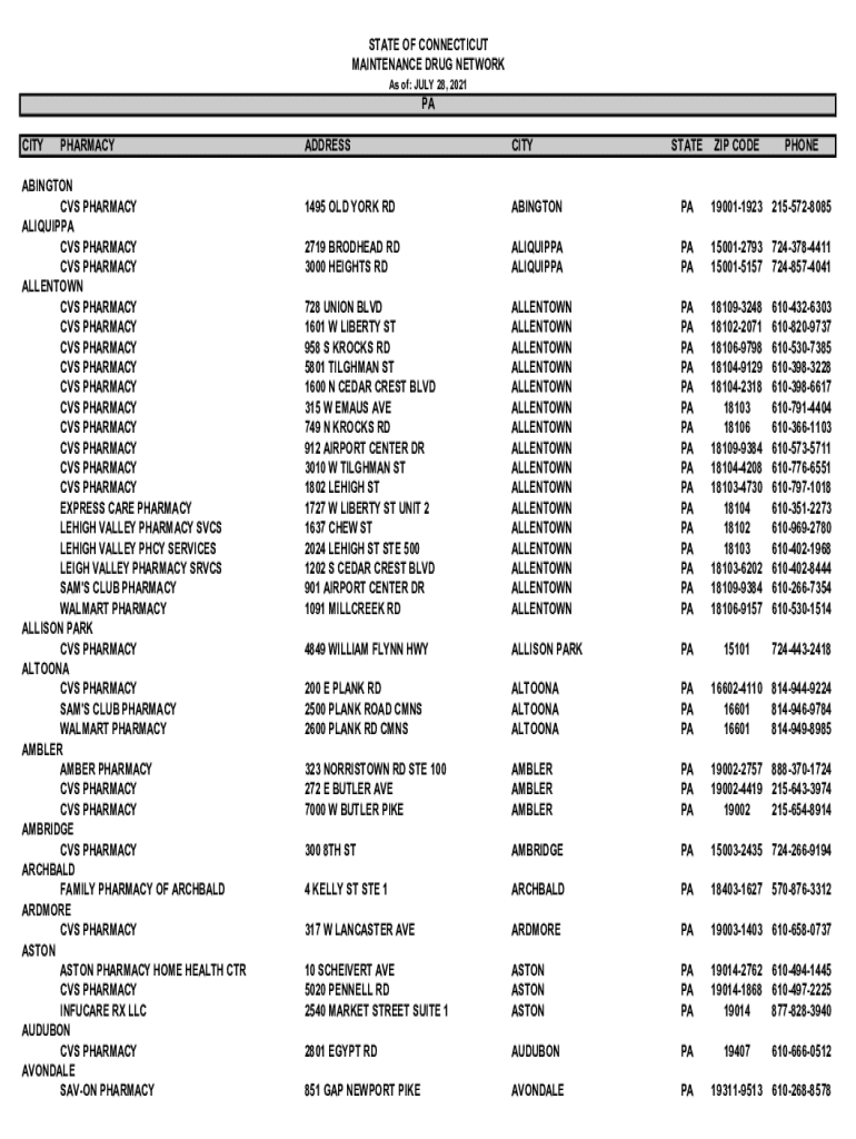 STATE OF CONNECTICUT MAINTENANCE DRUG NETWORK As of: JULY 28, 2021PACITYPHARMACYABINGTON CVS PHARMACY AREQUIPA CVS PHARMACY ALLENTOWN CVS PHARMACY EXPRESS CARE PHARMACY LEIGH VALLEY PHARMACY SACS