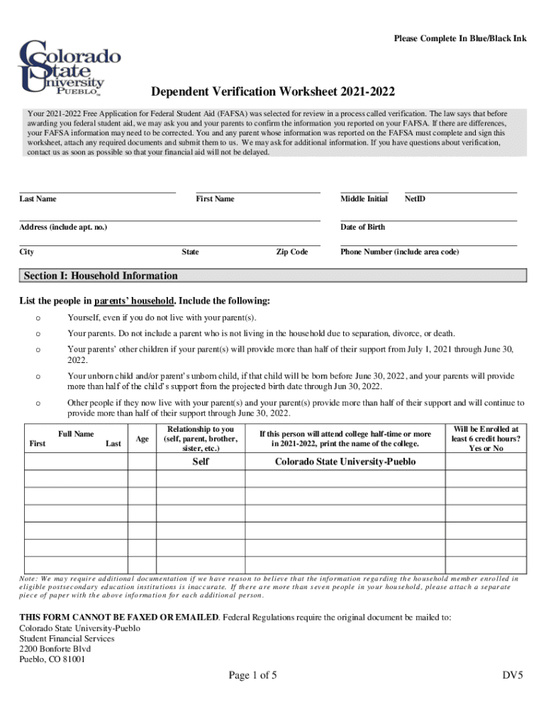 Please Complete In Blue/Black Independent Verification Worksheet 20212022 Your 20212022 Free Application for Federal Student Aid (FAFSA) was selected for review in a process called verification. The